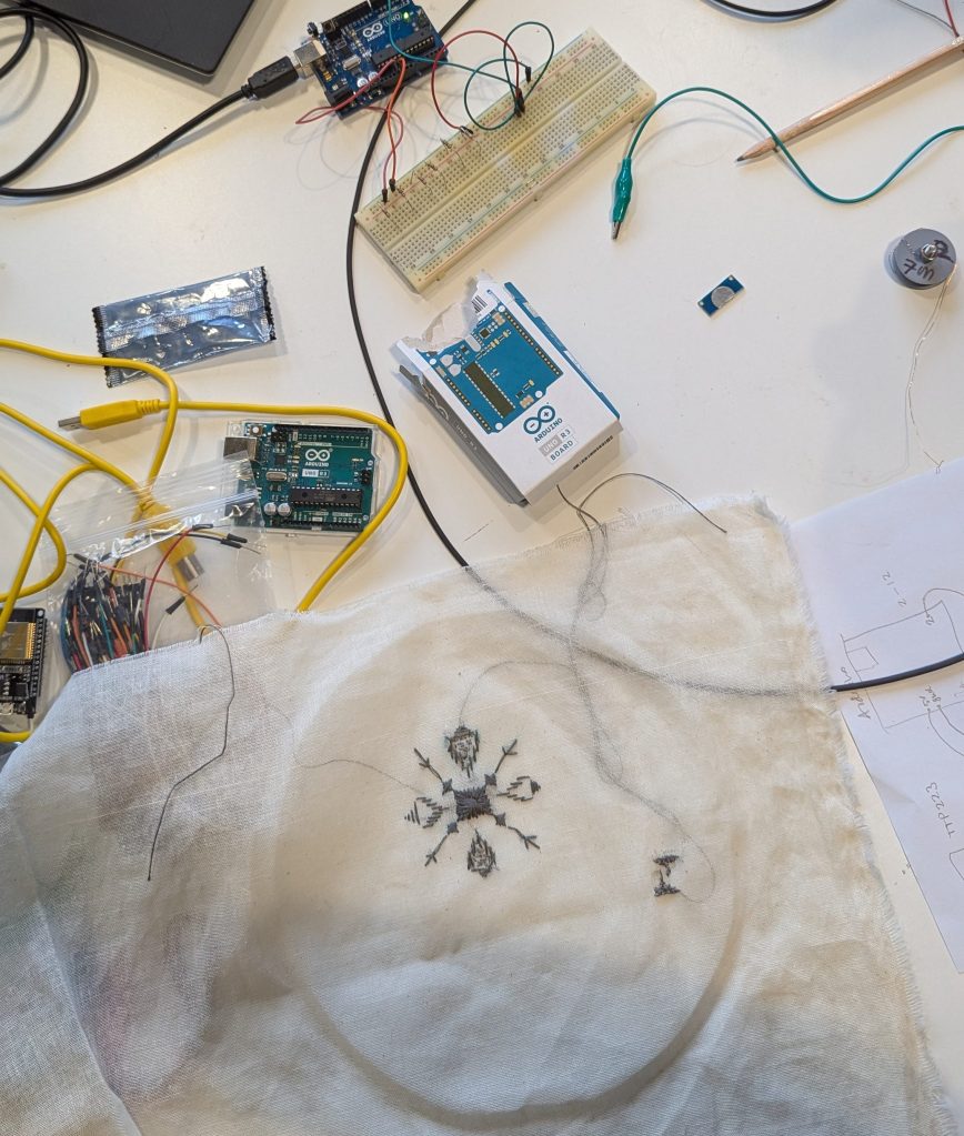 The initial research of my current project received support from Cross-TIC. It is an interactive installation that combines e-textiles, projection mapping, and experimental animation and it builds on my ongoing research on needlework’s potential for resistance and solidarity.