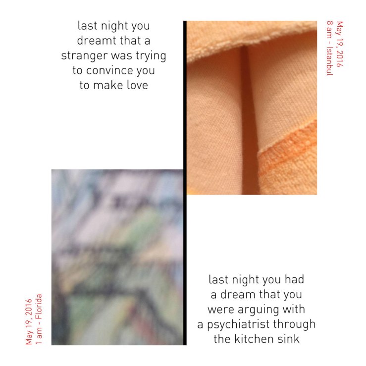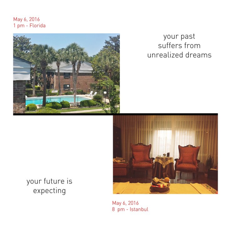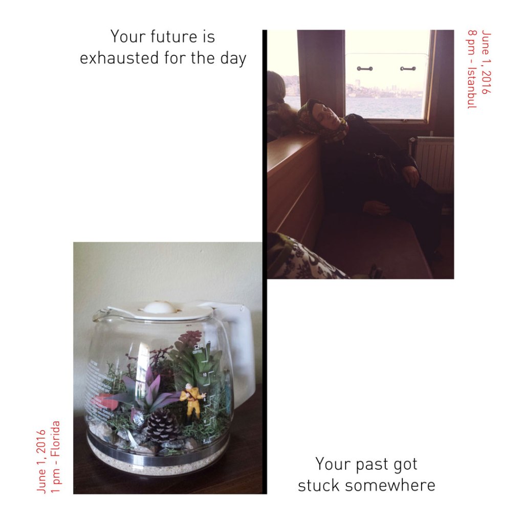 As residents of Digital Artist Residency, Marsha Franco and I shared 2 photos each day with a caption (one from Istanbul, Turkey, one from Florida, USA) at a specific time and due to the 7-hour time difference between Turkey and the USA, we, in a sense, witnessed each other’s past and future while showing the present. See the work in its entirety here.